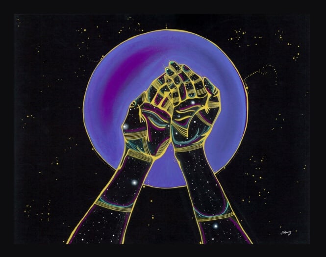 Deeply mystical. The astrologers hands reaching into the pool of stars. Opaque acrylic on crescent ragmat. Printed on acid-free velvet fine art paper. Archive quality certified. **Please allow 7-12 business days to receive shipping and handling info, as each print is printed to order. Go to my contact page to send inquiries on S&H outside of the US & Canada, and to inquire about specialty/larger size options beyond the listed options.